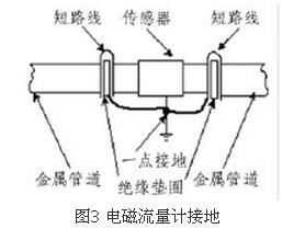 由于一體式污水流量計價格的測量感應電壓很小,電壓較低,易受外界電磁噪聲的影響,故在安裝時應進行可靠的接地連(跨)接。金屬管道一體式污水流量計價格接地連(跨)接方法如圖3所示。