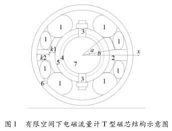 T型磁芯是為較小的空間下實現(xiàn)盡可能大的勵磁線圈而提出的,如圖1所示為較小空間結構下,設計有T型磁芯的井水流量計傳感器截面圖。在圖中1表示線圈位置;2表示磁芯位置;3表示電*及其固定器件位置;4表示襯里位置;5表示內(nèi)徑壁位置;6表示外徑壁;7表示測量管道(測量區(qū)域)。如圖1所示井水流量計勵磁結構磁芯造型近似為T型(因稱為T型磁芯),磁芯在靠近井水流量計內(nèi)管道時為T型磁芯的較長端。如圖中所示,T型磁芯較長端與x軸夾角為a,T型磁芯較短端與x軸夾角為b,T型磁芯較長端寬度為k1,T型磁芯較短端寬度為k2。