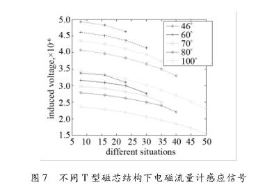 從仿真結果可以看出:T型磁芯的較長端的角度a越小,流量計電*兩端獲得的感應信號越大;在T型磁芯的較長端的角度a一定時,T型磁芯的較短端的角度b越小,流量計電*兩端獲得的感應信號越大。這主要是因為井水流量計勵磁線圈的增加,使得流量計測量區(qū)域的磁場強度增加,同樣分布的流速下使得流量計電*兩端的感應信號增加。
