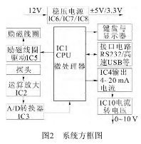 裝置采用模塊(裝置采用模塊(STM32F217STM32F217)來控制電磁流量)來控制化工污水流量計選型的工作,包括產(chǎn)生勵磁脈沖方波信號、接收從探頭計的工作,包括產(chǎn)生勵磁脈沖方波信號、接收從探頭送來的反映流量大小的微弱電信號、輸出送來的反映流量大小的微弱電信號、輸出4~20mA電流信號供指示儀表用,模塊附帶有各類接口電路電流信號供指示儀表用,模塊附帶有各類接口電路(RS232、高速USB接口等)。裝置包括:接口等)。裝置包括:IC1單片機、IC2前置放大器、IC3A/DIC3A/D轉(zhuǎn)換器、IC4電壓轉(zhuǎn)電流模塊、IC5勵磁線圈的驅(qū)動模磁線圈的驅(qū)動模塊電路、IC6電壓轉(zhuǎn)換模塊,以壓轉(zhuǎn)換模塊,以及USB快速接口電路、IC9芯片與周圍元件組片與周圍元件組成的RS232接口等電路。方框口等電路。方框圖如圖2所示。