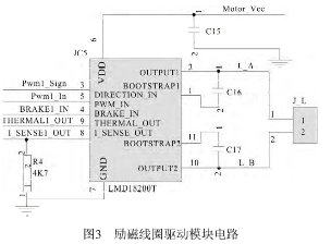 由于探頭尺寸較小,所產(chǎn)生的勵磁電流很弱,由于探頭尺寸較小,所產(chǎn)生的勵磁電流很弱,要處理這樣的信號,則后續(xù)的放大電路要有足夠高要處理這樣的信號,則后續(xù)的放大電路要有足夠高的輸入阻抗和較大的增益,來保證傳感器的靈敏度的輸入阻抗和較大的增益,來保證傳感器的靈敏度及抗干擾性;為了防止交流及抗干擾性;為了防止交流50Hz的工頻干擾,選的工頻干擾,選用方波電流作為勵磁電流,其頻率選用用方波電流作為勵磁電流,其頻率選用12.5Hz,它是1/4的工頻頻率,這樣可有效地抑制工頻干擾。勵磁信號在單片機內(nèi)部生成,從*勵磁信號在單片機內(nèi)部生成,從*26腳輸出12.5Hz方波信號,接到勵磁線圈的驅(qū)動模塊電路方波信號,接到勵磁線圈的驅(qū)動模塊電路IC5(LMD18200T LMD18200T)的3腳信號,它的內(nèi)部采用腳信號,它的內(nèi)部采用H橋式驅(qū)動,送出勵磁電流加到其橋式驅(qū)動,送出勵磁電流加到其2腳和10腳之間的勵磁線圈上。在勵磁線圈L上形成20~30mA方波電流,它與控制方波電壓同步。使流體運動切割波電流,它與控制方波電壓同步。使流體運動切割磁力線產(chǎn)生的方波電壓與勵磁電流完全保持同步, 磁力線產(chǎn)生的方波電壓與勵磁電流完全保持同步,這樣也便于在接收放大電路中信號的同步解調(diào)。電路如圖3所示。