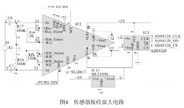 IC2(SL28617)放大器用于放大傳感器送來)放大器用于放大傳感器送來的反映流量大小的電壓信號,圖中的反映流量大小的電壓信號,圖中Rin和Rfb是用來改變運算放大器增益的電阻。來改變運算放大器增益的電阻。S1是勵磁信號源,R17、R18是輸入偏置電阻,運放的是輸入偏置電阻,運放的9腳和16腳分別接電源±腳分別接電源±5V,接在運放IC2輸出端的IC3(ADS8320 ADS8320)是16位高速A/D轉(zhuǎn)換器,其轉(zhuǎn)換速度可達16kHz/s,接在接收放大器與接在接收放大器與A/D轉(zhuǎn)換器之間的IC12(ISL21090 ISL21090)是三端穩(wěn)壓器。電路如圖)是三端穩(wěn)壓器。電路如圖4所示。