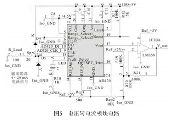 IC4(AD420)是一塊電壓轉(zhuǎn)電流模塊,可將電壓信號轉(zhuǎn)換成電流信號輸出,輸出電流范圍是4~20mA或0~20mA,其后面可以接模擬指示儀表。接其后面可以接模擬指示儀表。接在其輸出端的IC10(LM358)是運放,可將輸出電流轉(zhuǎn)換成電壓輸出,電壓輸出范圍流轉(zhuǎn)換成電壓輸出,電壓輸出范圍0~10V。電路如圖5所示。