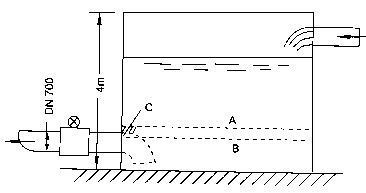 案例4 廣西某水廠在郊區(qū)山頭設(shè)置清水池,利用水池高度勢能發(fā)送成品水。運(yùn)行人員反映計(jì)量出水量的DN700mm酸堿污水流量計(jì)有時候流量顯示不穩(wěn)?;蝿舆_(dá)百分之十幾到百分之二十,誤差也大,估計(jì)相差約20%?,F(xiàn)場考查發(fā)現(xiàn)水池如圖7-9所示安裝流量傳感器,水位高度不足就會卷入氣泡,甚至流量傳感器測量管內(nèi)不能充滿。如水位降至A線時,雖高出吸入口頂端,但高出不多,還會在C處產(chǎn)生旋渦,將水位表面空氣卷入形成氣泡,使顯示晃動;若水位降到B,測量管將不滿管。我們建議如圖虛線所示裝一彎頭,擴(kuò)大水池有效容量,減少吸入氣泡的機(jī)會,彌補(bǔ)原設(shè)計(jì)的不足。這類實(shí)例是經(jīng)常遇到的。
